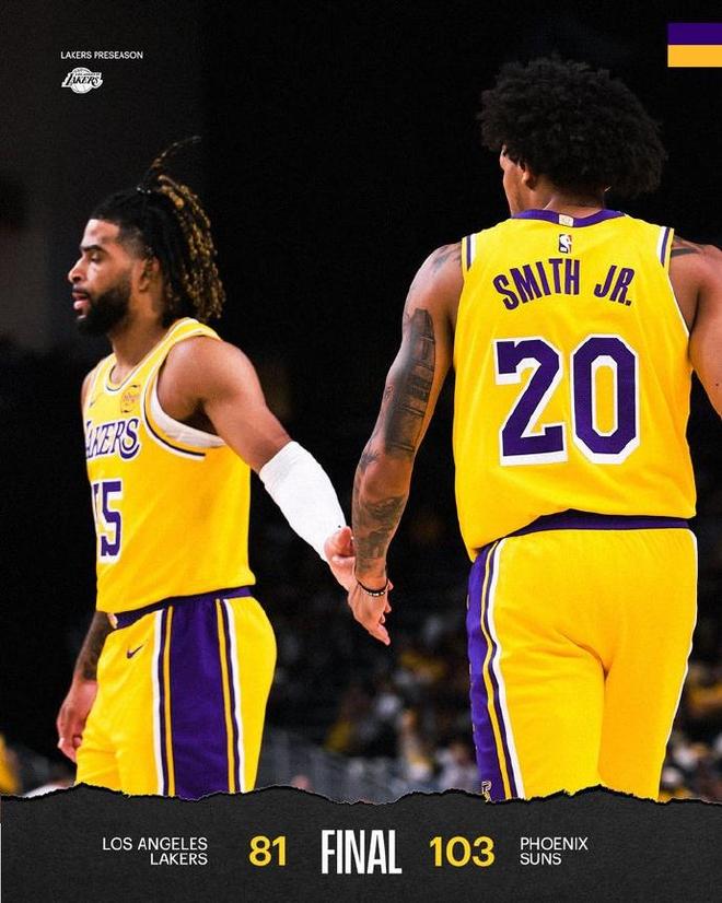 北京时间10月4日,NBA季前赛继续展开,湖人对阵太阳。本场比赛詹姆斯和东契奇缺席,上来里夫斯状态不错,两队陷入拉锯战,可在之后湖人未能顶住,首节落后15分,而在次节湖人一波18-2攻势缩小分差,可随后未能顶住,下半场则完全陷入被动,分差被拉开到20分以上,比赛也早早失去悬念。最终,湖人81-103惨败太阳。