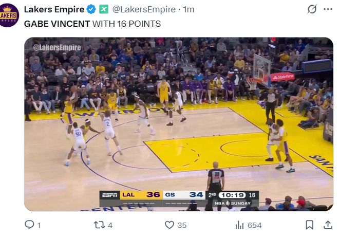 文森特这场比赛复出,这是他今年第一场季前赛,因为东契奇、詹姆斯、里夫斯等核心都不打,文森特成为持球第一核心,这下文森特不负德莱文之名,首节成为湖人救世主疯狂帮助球队缩小分差。湖人盛赞他回到了22-23赛季季后赛的他,场均13+4+三分命中率38%。