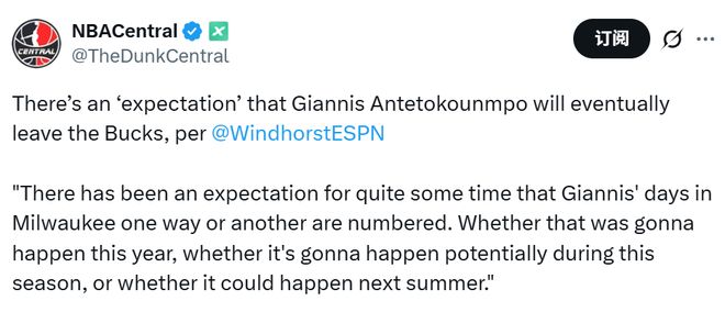 在ESPN最新的节目上,名记文霍斯特表示,外界普遍预计字母哥最终会离开雄鹿队。“很长一段时间以来,外界一直认为,不管以何种方式,字母哥在雄鹿队的日子都屈指可数了。不确定这种情况会在今年发生、本赛季期间发生,还是可能在明年夏天发生。”