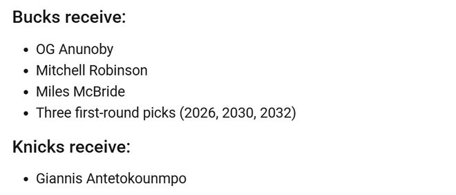 据此前名记Shams报道,字母哥仍在评估自己在雄鹿的未来,而且表态除了雄鹿,他只愿意效力尼克斯。两队在今年8月有过交易谈判,但最终没有取得进展。美媒今日也晒出了一笔尼克斯交易字母哥的潜在6换1方案,具体是尼克斯送出阿奴诺比、米切尔-罗宾逊、麦克布莱德和三个首轮签,从雄鹿换来字母哥。