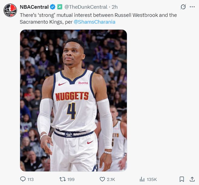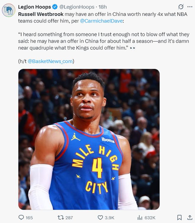 一天之前,国王记者Carmichael Dave曾透露,威少收到一份来自中国球队的报价,这份报价大约是国王能给出的四倍之多,而且这份合约只有半个赛季。(但从今天的消息来看,威少还是希望在NBA打球)